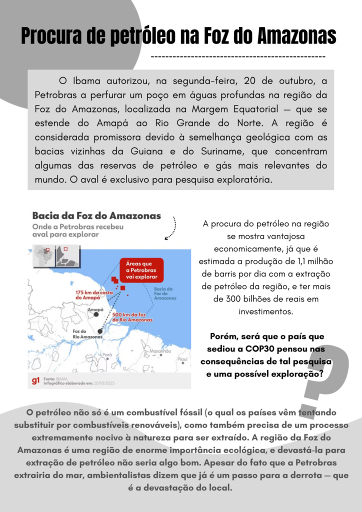Contradição 1: No mesmo ano que o Brasil sedia a COP 30, ocorre a autorização da perfuração da Foz do Amazonas, para a exploração e procura de petróleo.